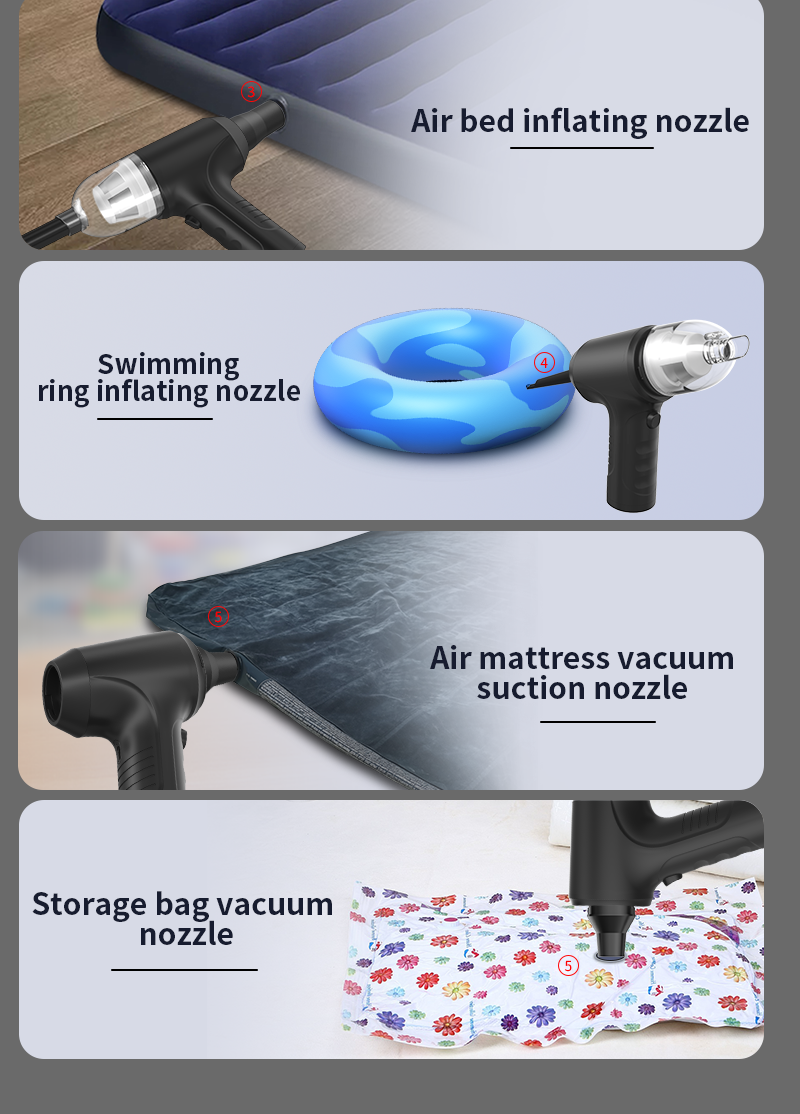 Acessórios: bocal de sopro, bocal de sopro de escova, bocal de sopro para cama de ar, bocal de exaustão da cama de ar,bocal de sopro de anel de natação,bocal de vácuo, bocal de vácuo de escova,filtro lavável,copo de vácuo, caixa de Cores, manual, Cabo usb tipo C 60cm,bolsa de pano