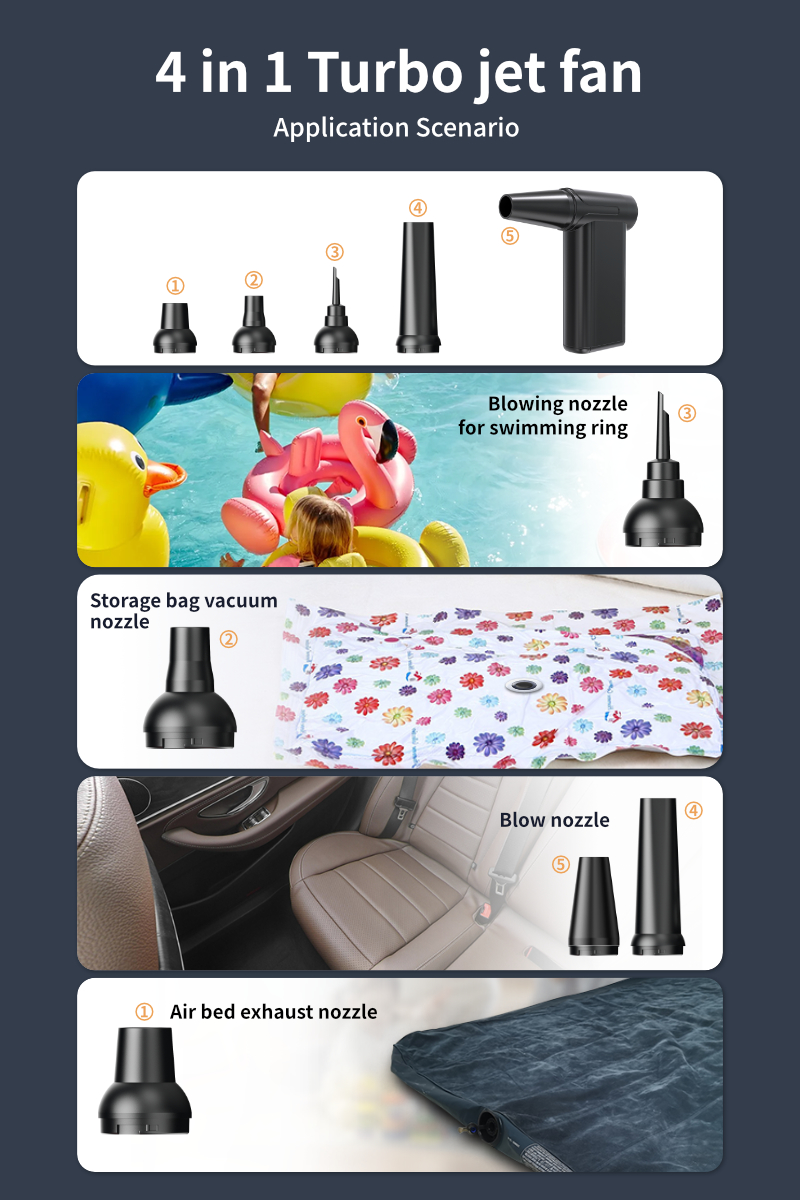 Acessórios: bocal de sopro longo, bocal de sopro curto, bocal de sopro para cama de ar, bocal de exaustão da cama de ar,bocal de sopro de anel de natação, caixa de Cores, manual, Cabo usb tipo C 60cm, bolsa de pano
